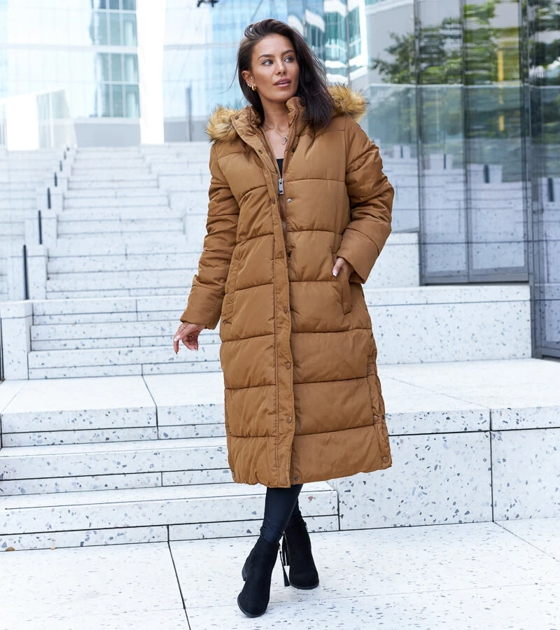 Braune lange Jacke mit abnehmbarer Kapuze Fela