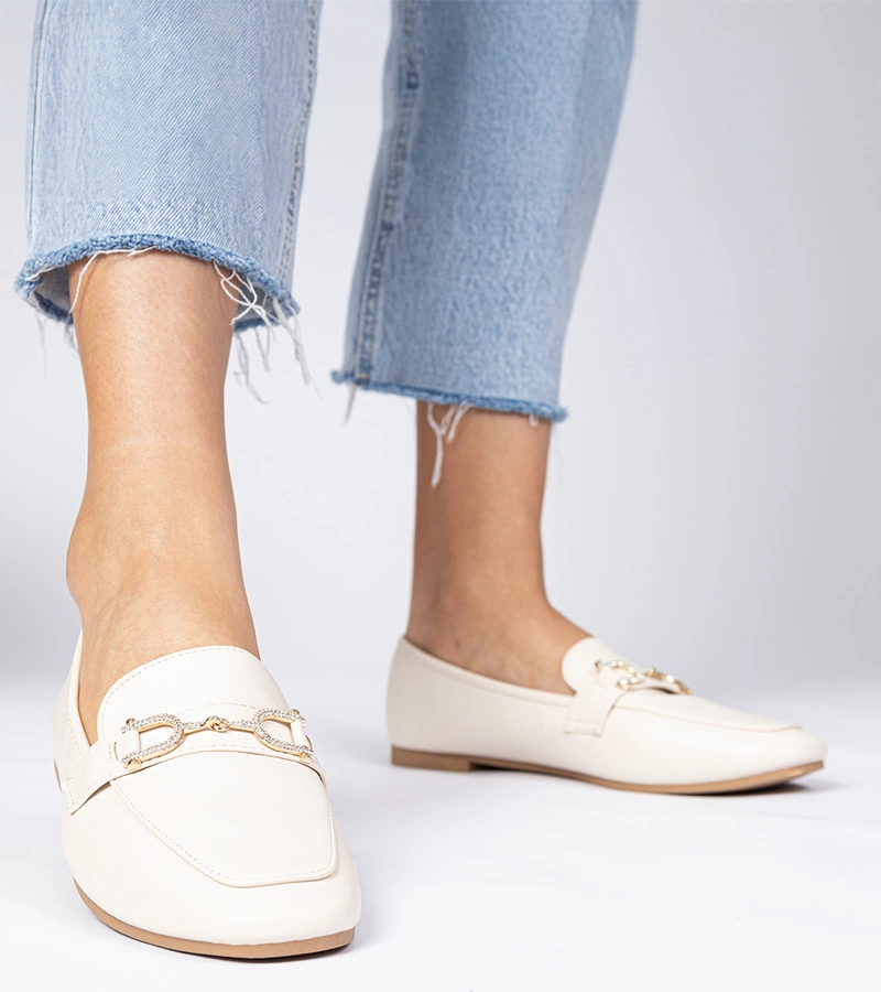 Beige elegante Mokassins mit goldener Verzierung und Strasssteinen Kalisa