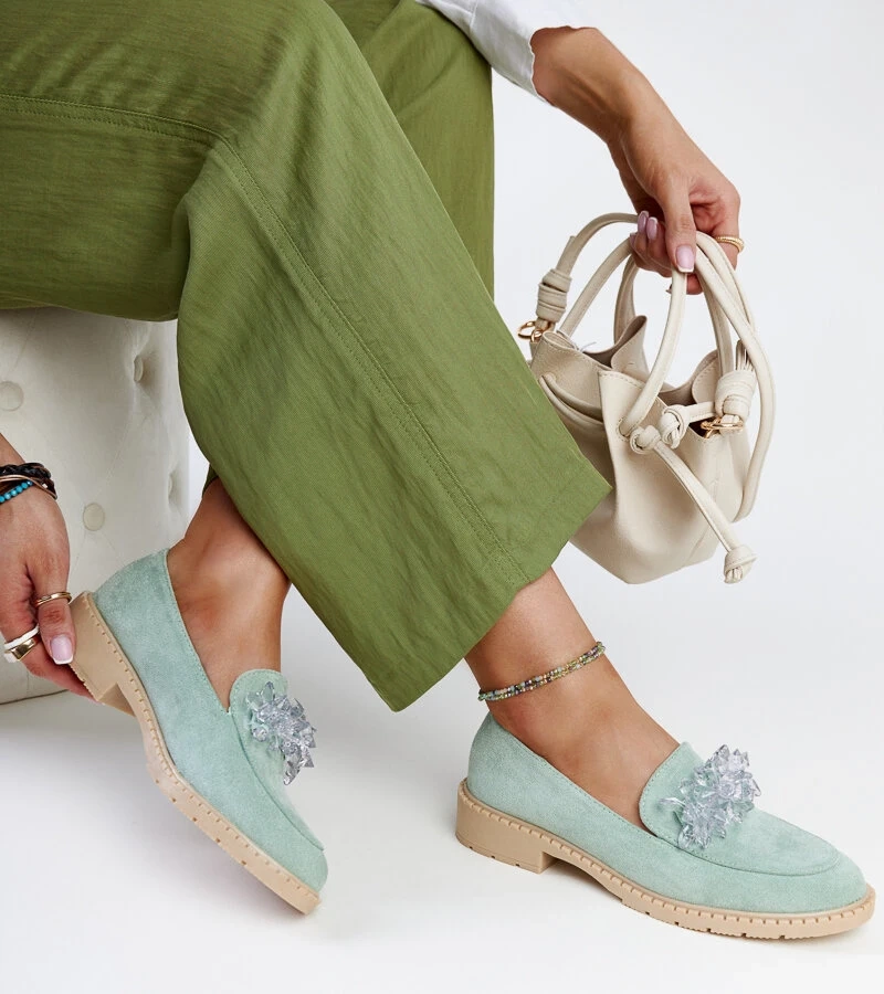Hellgrüne Wildleder-Mokassins mit Zemzem-Kristallen