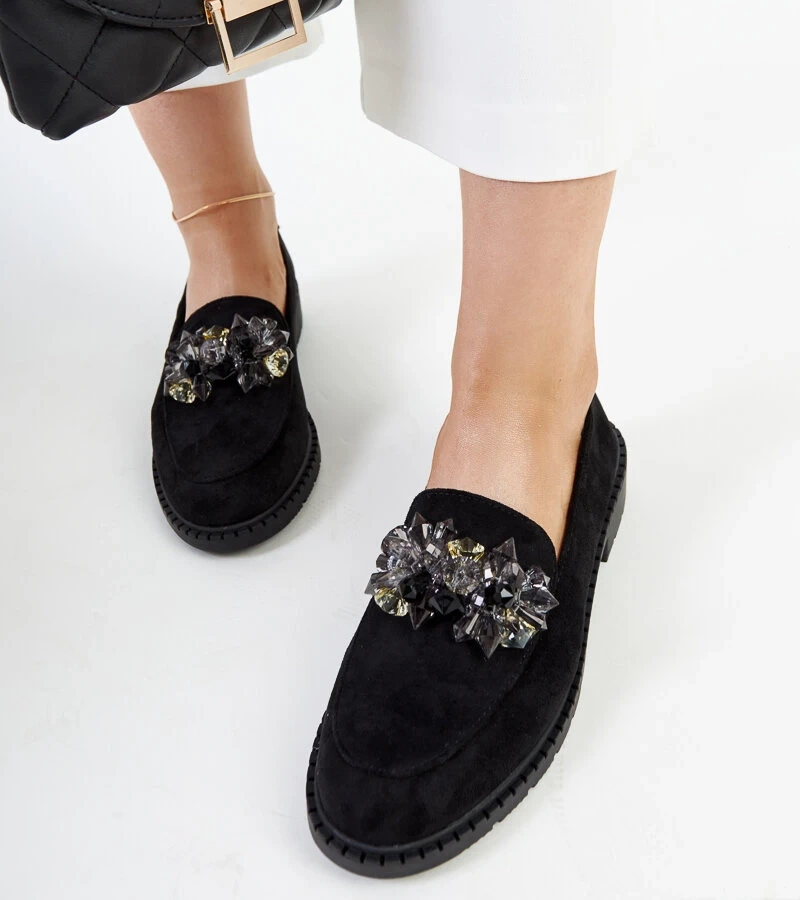Schwarze Wildleder-Mokassins mit Zemzem-Kristallen