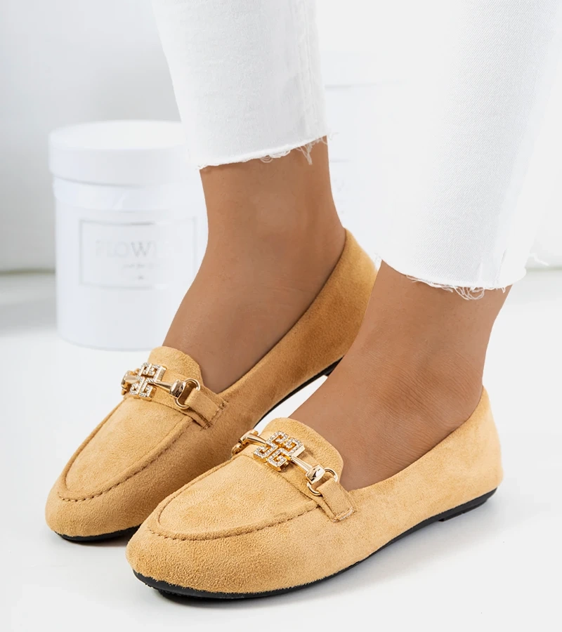 Beige Mokassins mit goldener Hashtag-Verzierung