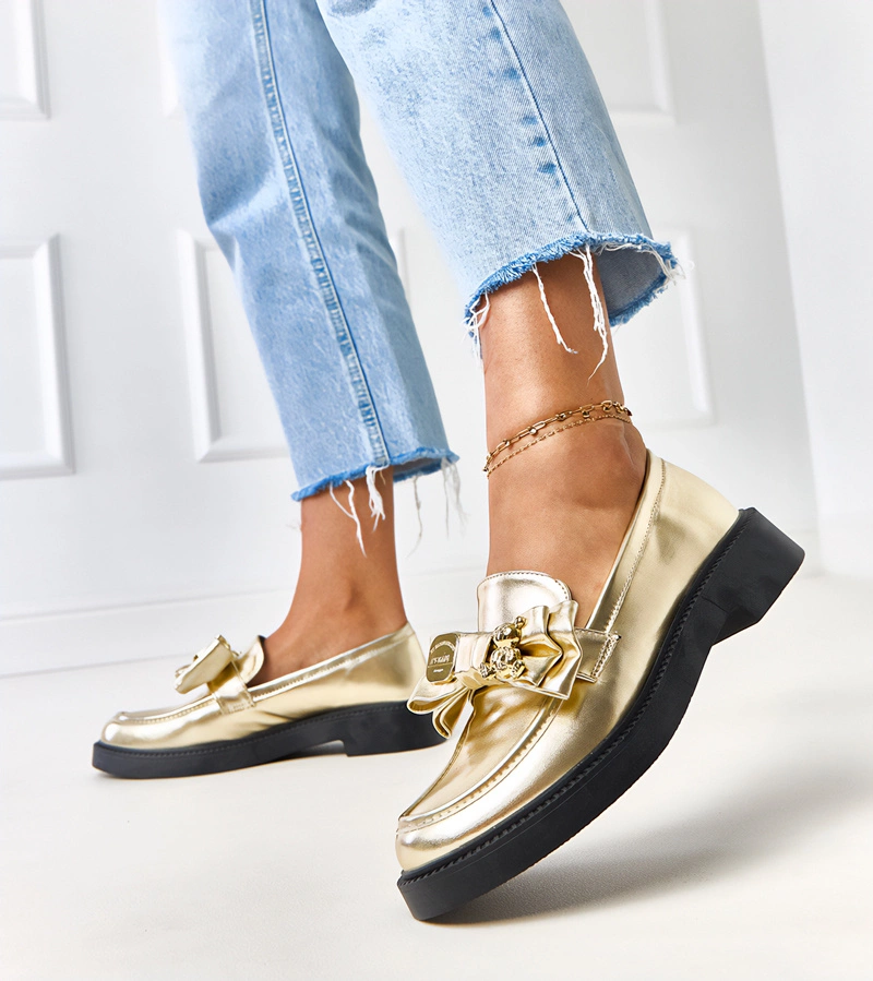 Goldene elegante Mokassins mit goldener Verzierung und Strasssteinen Kalisa