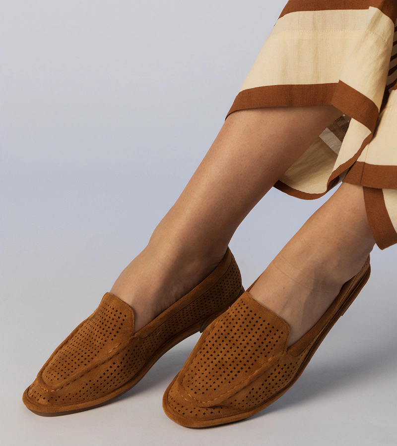 Karamellfarbene durchbrochene Mokassins aus Öko-Wildleder Stanila