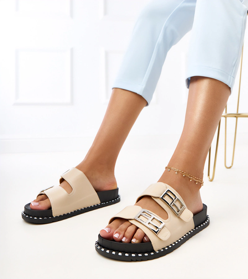 Beige Pantoletten mit dekorativer Schnalle am Riemen Flius
