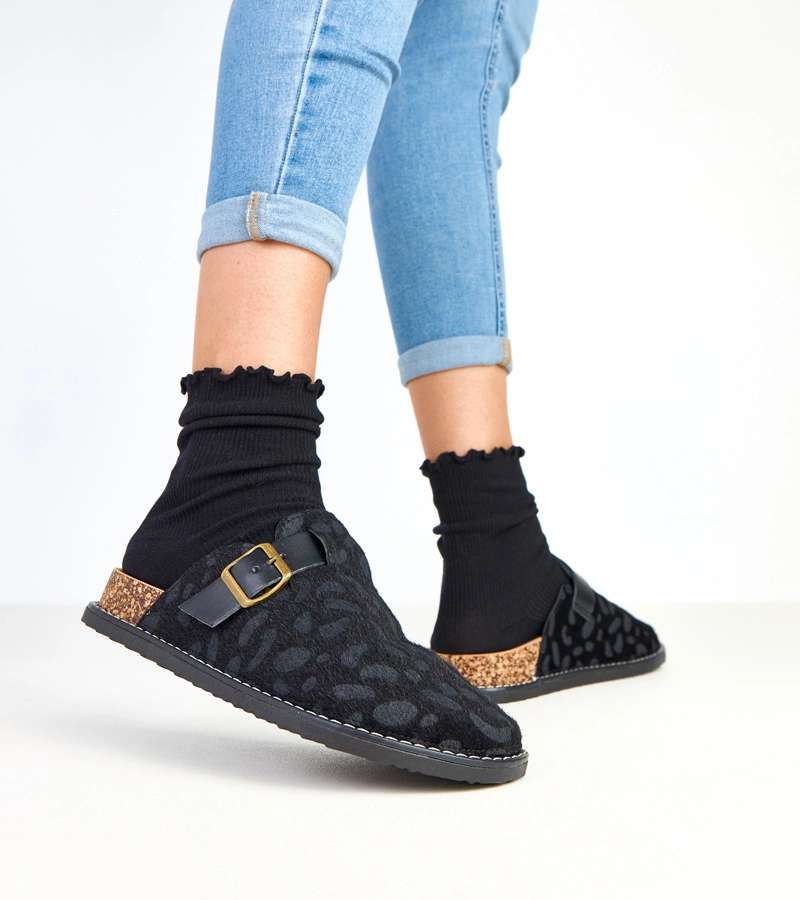 Schwarze Damenpantoletten auf Korkplattform mit Leopardenmuster Diane