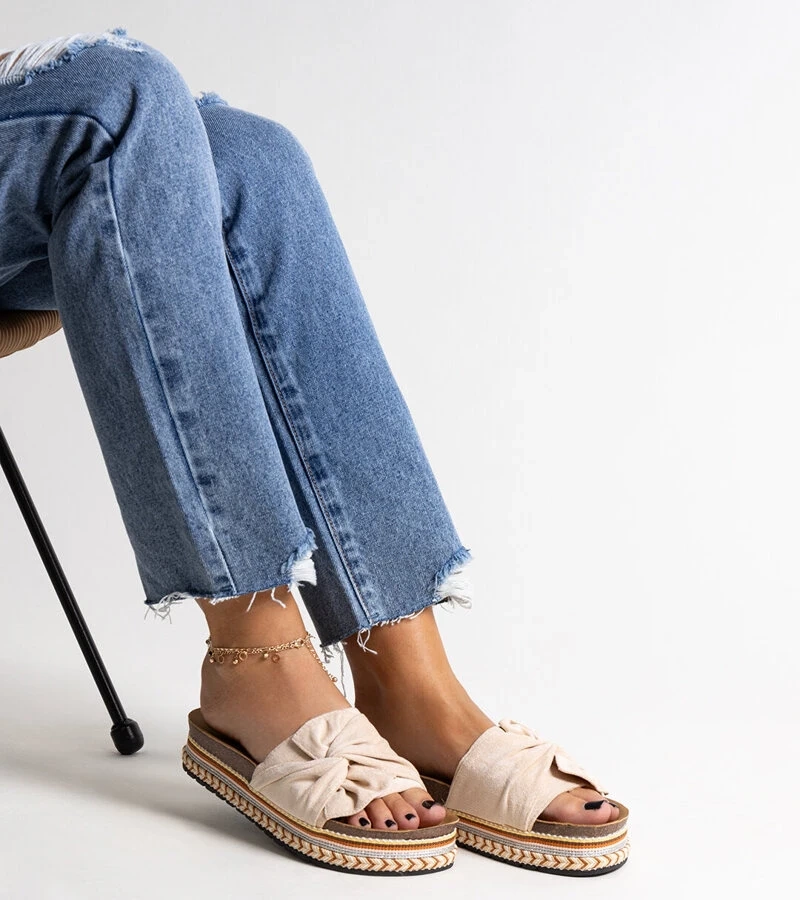 Hellbeige Pantoffeln auf einer Korksohle mit Petresa-Schleife