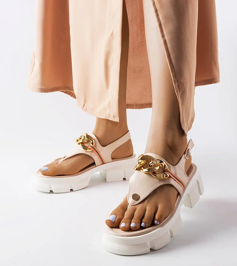 Beigefarbene Sandaletten mit niedrigem Keilabsatz Jolanta