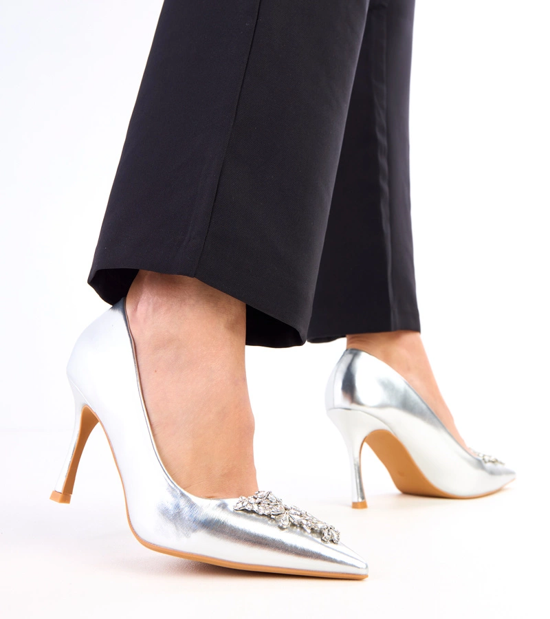 Silberne lackierte Stilettos verziert mit Strasssteinen Almana