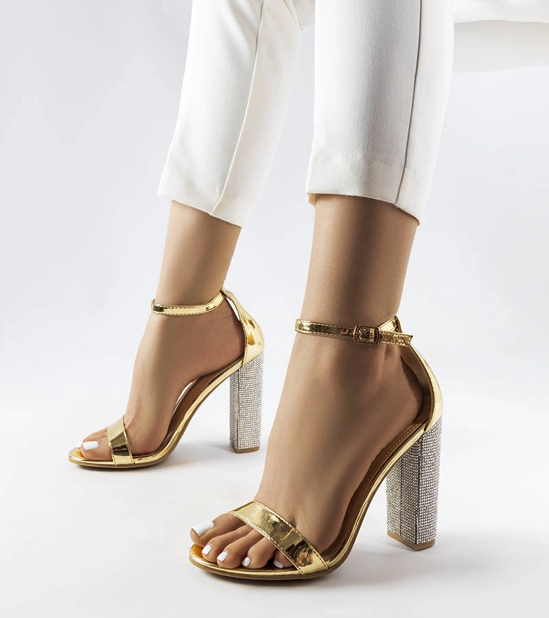 Goldene elegante Sandalen mit Absatz verziert mit Strasssteinen Tarlina