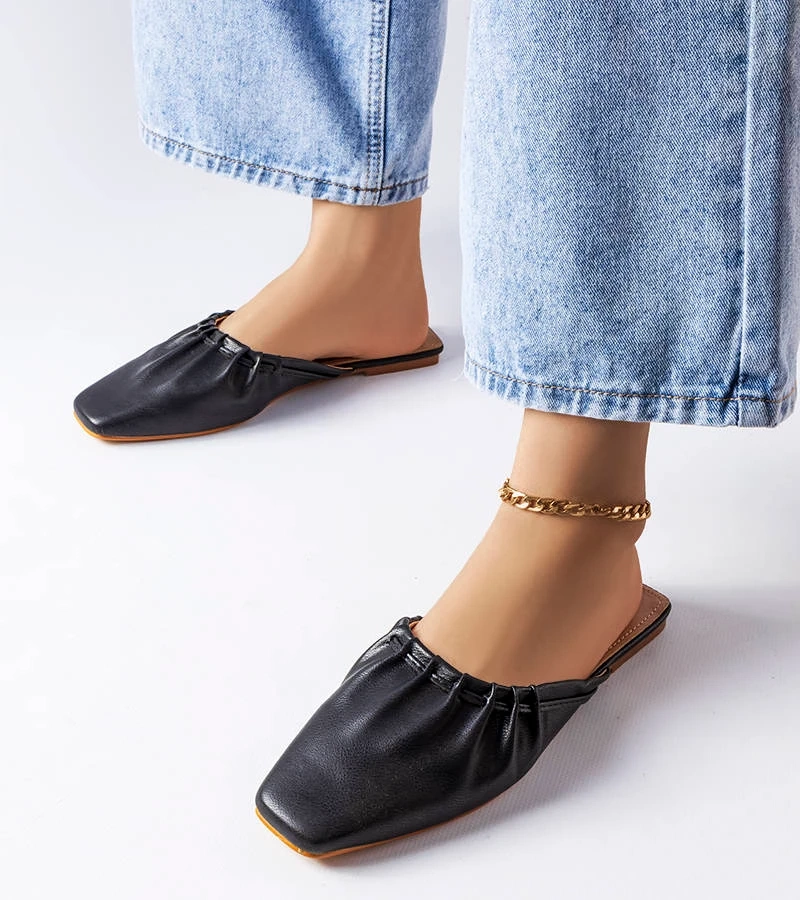 Schwarze gekräuselte Pantoletten mit Aasiaat-Spitze